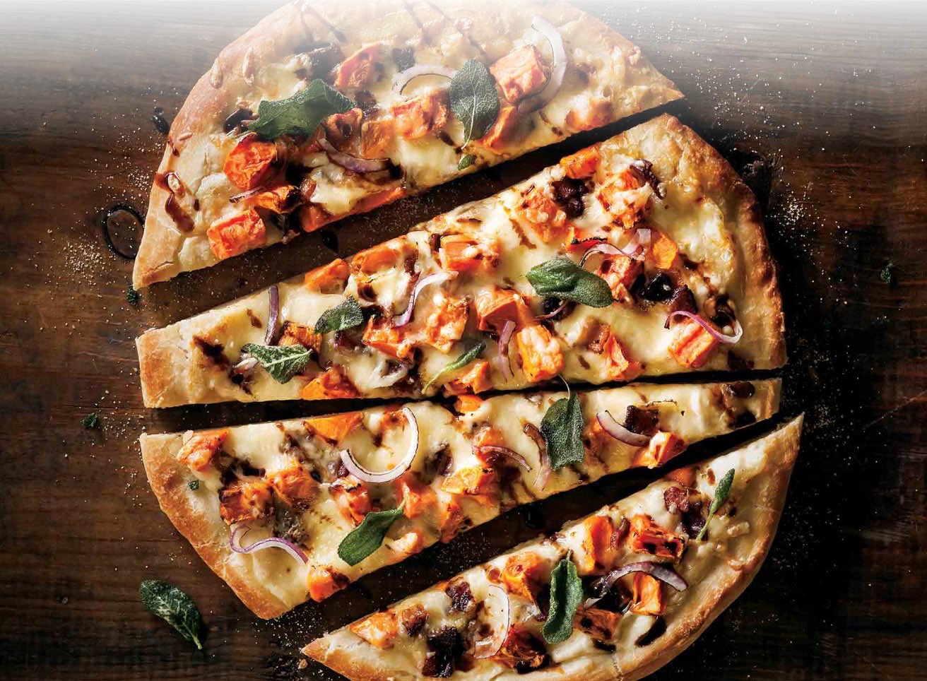 This unique, and easy-to-make pizza stars Simplot RoastWorks® Sweet Potatoes inventively combined with alfredo sauce, buttery fontina cheese, crispy Bonici® bacon, and topped off with a sweet contrasting drizzle of balsamic vinegar. Delicate fried sage leaves make an elegant garnish. This also showcases well as a flatbread option.